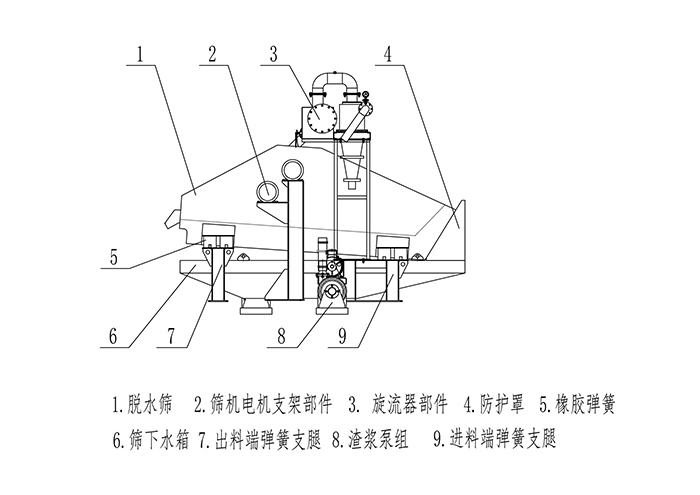 該設(shè)備一般直接安裝于洗砂機(jī)后部,設(shè)備上的脫水篩對洗砂機(jī)的成品物料進(jìn)行再一步脫水,設(shè)備上的回收系統(tǒng)則對洗砂機(jī)排出的廢料進(jìn)行再回收,充分解決了洗砂機(jī)的弊端(如:成品含水量大、含泥量大、粉塵多、雜質(zhì)難以清除等),大大提高了成品的品質(zhì)。旋流器將洗砂廢水中的細(xì)砂與水分離后,將濃度被提升至60-70%的細(xì)砂排入脫水篩表面進(jìn)行脫水,實(shí)現(xiàn)細(xì)砂的脫水回收。