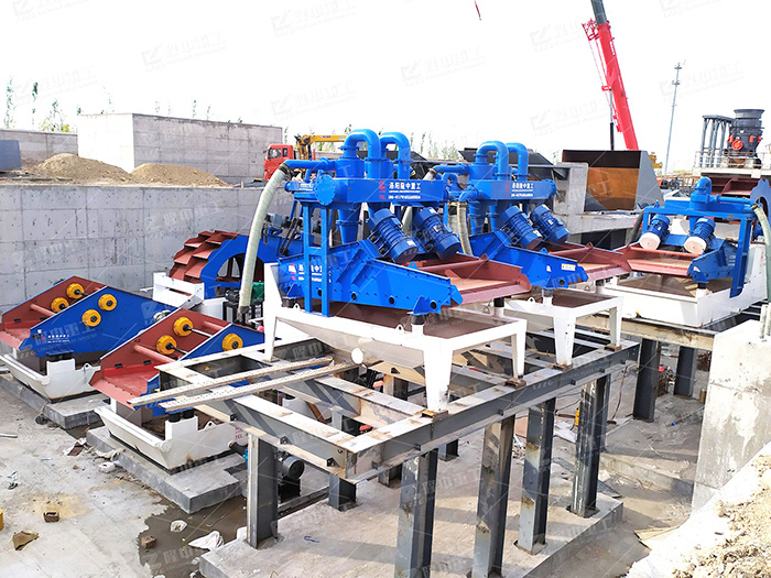 該設(shè)備是隆中結(jié)合砂粉的實際情況而設(shè)計的具有技術(shù)水平的細砂提取裝置,泵將篩下水箱中的砂水混合物輸送至分離系統(tǒng),經(jīng)分離器濃縮的細砂由分離出料口提供給脫水篩,與篩上粗砂一起脫水后產(chǎn)出成品砂,實現(xiàn)細砂回收的利用。脫水篩脫水過程中,少量細砂透過篩網(wǎng)再次回到篩下水箱,經(jīng)泵與分離系統(tǒng)重復(fù)抽取,再次回收,最終實現(xiàn)細砂的有效回收。