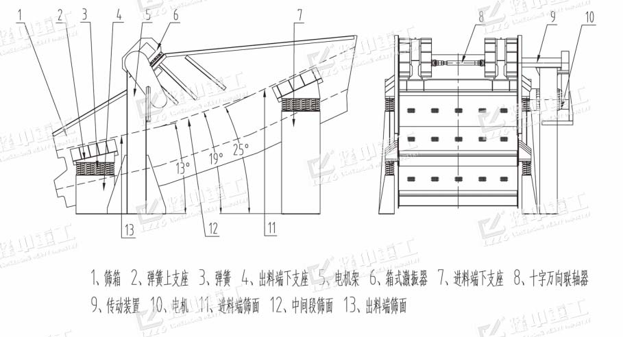 1、應(yīng)用等厚篩分原理,針對不同的物料特性,采用不同的振動(dòng)參數(shù)、分段數(shù)量及篩面傾角,篩面傾角過度平緩,篩面分段數(shù)量4~7段,能夠保篩分效果。同時(shí)平緩的傾角過度和較多的分段數(shù)量有利于篩面壽命提高。